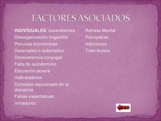 Este documento trata sobre el maltrato infantil. Define el maltrato infantil y explica que puede incluir maltrato físico, emocional, sexual y negligencia. También identifica algunas causas comunes como las relaciones entre los padres, la relación con el niño y factores de estrés. Finalmente, enfatiza la importancia de concientizar a la población sobre este tema y prevenir la violencia familiar.