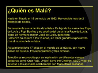 Malú es una cantante española nacida en Madrid en 1982. Proviene de una familia de artistas y ha vendido más de 2 millones de discos. A lo largo de su carrera musical de 17 años ha publicado nueve álbumes de estudio, tres recopilatorios y tres discos en directo. También se ha involucrado en causas benéficas y la defensa de los animales.