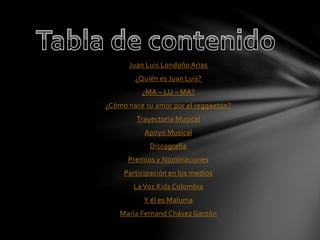 Este documento resume la biografía del cantante colombiano Maluma. Nació en Medellín en 1994 y comenzó a cantar desde pequeño ante compañeros y familiares. Su nombre artístico "Maluma" proviene de las iniciales de sus familiares. Se ha dedicado al género del reguetón y ha tenido éxito internacional, recibiendo varios premios como el Grammy Latino al Mejor Artista Nuevo.