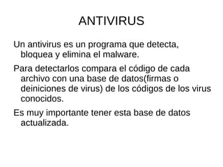 Este documento describe diferentes tipos de malware y cómo funcionan los antivirus para proteger los sistemas. Explica que los antivirus comparan los archivos con una base de datos de códigos maliciosos conocidos para detectar virus, gusanos, troyanos y otros. También describe amenazas como el spam, spyware, dialers, exploits y hoaxes, así como direcciones de interés para obtener más información sobre seguridad.