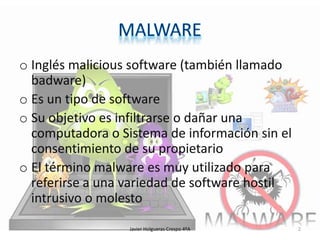 El documento analiza el malware, un tipo de software diseñado para infiltrarse y dañar computadoras sin permiso, abarcando diferentes tipos como virus, gusanos y troyanos, así como sus métodos de propagación y efectos perjudiciales. Además, destaca el crecimiento exponencial de estas amenazas en los últimos años y sus implicaciones económicas. Se mencionan también estrategias para prevenir infecciones y el uso del malware con fines económicos.