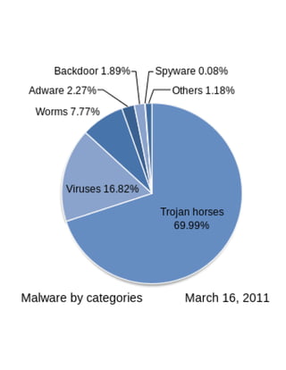 1) El malware incluye virus, gusanos, troyanos y spyware que dañan computadoras o roban información.