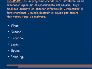 El documento describe diferentes tipos de malware, incluyendo virus, gusanos, troyanos, espías, spam y phishing. El malware son programas que se instalan en computadoras sin el consentimiento de los usuarios con el propósito de obtener información, ralentizar o destruir los equipos. Los virus, gusanos y troyanos pueden propagarse a otras computadoras e instalar puertas traseras, mientras que el spam envía correo no solicitado y el phishing roba información personal a través de correos falsos.