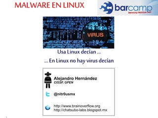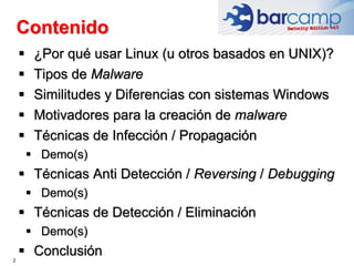 El documento aborda la presencia de malware en sistemas Linux, desmitificando la creencia de que son inmunes a virus. Se analizan diferentes tipos de malware, técnicas de infección y propagación, y las diferencias con sistemas Windows. Además, se discuten estrategias de detección y eliminación, concluyendo que aunque Linux es menos vulnerable, no está exento de amenazas y se requiere mejorar las soluciones de seguridad.
