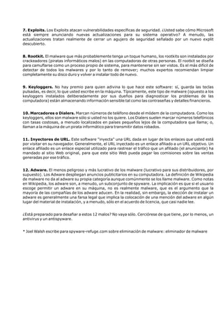 El documento describe 12 tipos comunes de malware, incluyendo virus, gusanos, troyanos, spyware, backdoors, exploits, rootkits, keyloggers, dialers, inyectores de URL y adware. Explica brevemente las características y comportamientos de cada tipo de malware, como cómo los virus se esconden en archivos y los troyanos roban información financiera. También advierte al lector que use software antivirus y antispyware para protegerse contra estos 12 tipos dañinos de malware.