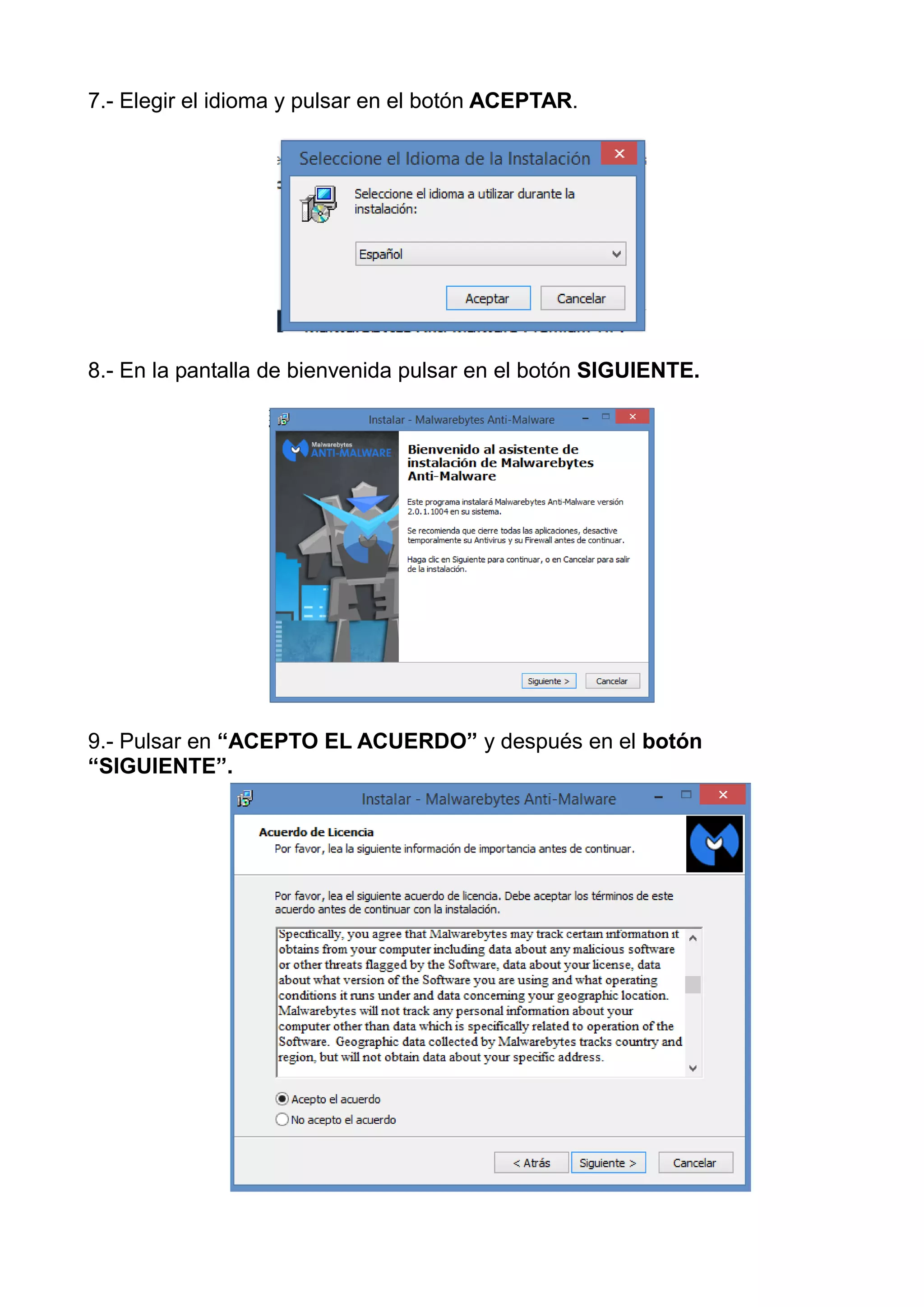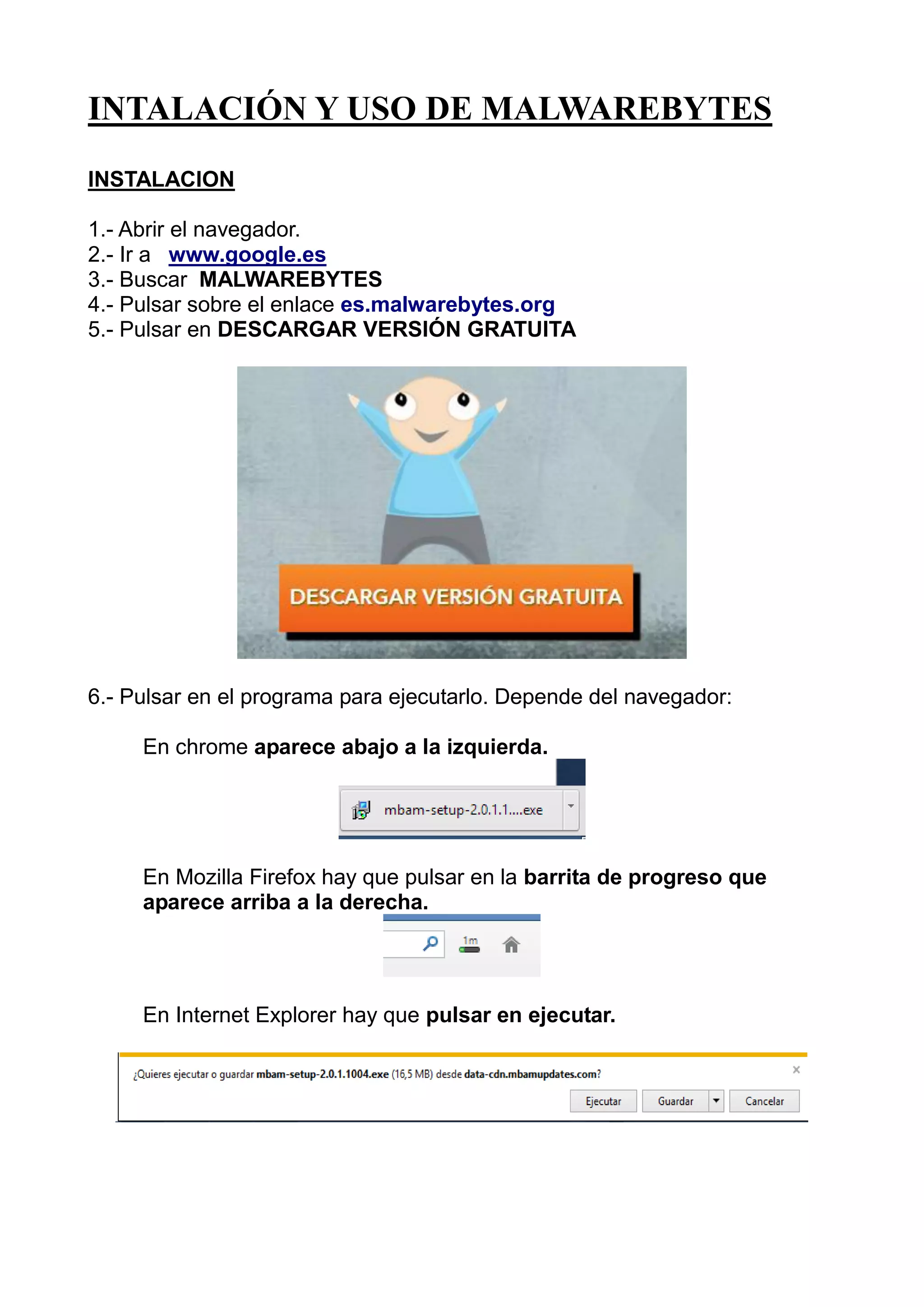 Este documento proporciona instrucciones para instalar y usar Malwarebytes. Explica cómo descargar e instalar el software de forma gratuita en 11 pasos. Luego describe cómo usar el programa para actualizar el antivirus, ejecutar búsquedas de malware y poner cualquier malware detectado en cuarentena en 8 pasos. Finalmente, indica que es necesario reiniciar el equipo para eliminar completamente las amenazas encontradas.