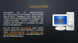 Este documento describe diferentes tipos de malware, incluyendo virus, gusanos, troyanos, spyware, phishing y puertas traseras. Explica cómo funcionan estos programas maliciosos y cómo infectan y propagan en sistemas. También da consejos sobre cómo prevenir infecciones de malware y qué hacer si un sistema ya está infectado.