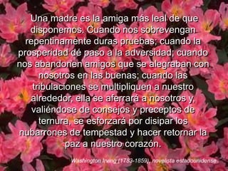 Este documento contiene varias citas y reflexiones sobre las madres y la maternidad. Resalta la importancia del amor y el sacrificio de las madres, y cómo su influencia moldea a los hijos y los acompaña a lo largo de toda la vida. También destaca que la maternidad es la vocación más noble y que las madres juegan un papel fundamental en la sociedad.