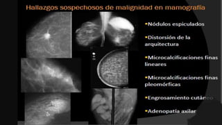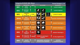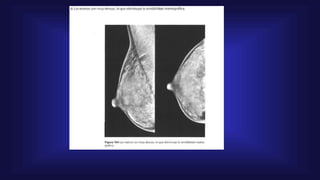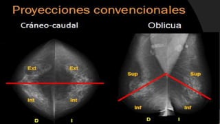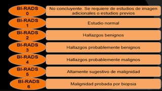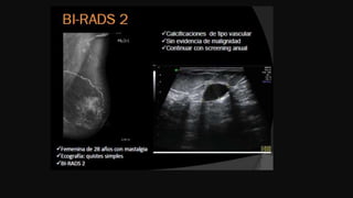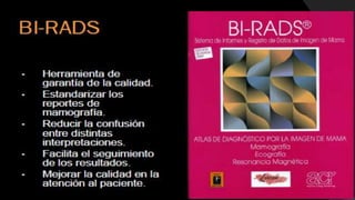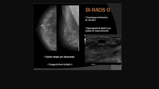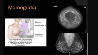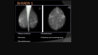 El documento detalla la anatomía de la mama, el procedimiento de mamografía digital y su importancia en el diagnóstico precoz del cáncer de mama. Se destacan las técnicas de imagen, la preparación de la paciente para el examen y las consideraciones especiales para aquellos con prótesis mamarias. Finalmente, se aborda la clasificación de los hallazgos en mamografías y su relación con patologías benignas y malignas.
