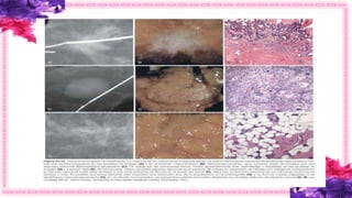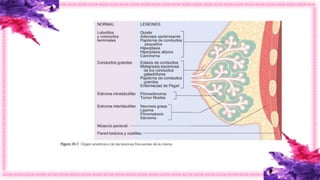 Este documento describe la anatomía y fisiología normal de la mama, así como varias enfermedades mamarias comunes. La mama se diferencia de otros órganos por su función de nutrición del lactante, sus cambios durante la lactancia y su importancia social y cultural. Las enfermedades mamarias más frecuentes incluyen dolor mamario, masas palpables, nodularidad difusa y secreción del pezón. El documento también describe trastornos del desarrollo mamario, manifestaciones clínicas, lesiones benignas como quistes,