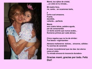 Este documento es una carta de una hija a su madre por el Día de la Madre. En ella, la hija describe a su madre como alguien fuerte, valiente y perfecta, con una mirada llena de inocencia y un cielo en sus ojos. También enumera cinco regalos que su madre le da: besos vigorizantes, abrazos mañaneros dulces y sinceros, su sonrisa de caramelo, el amor incondicional y eterno, y su mirada sincera y de inocencia duradera. La hija termina agradeciendo a