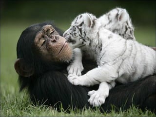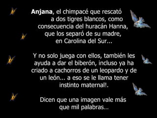 Un chimpancé llamado Anjana rescató a dos tigres blancos huérfanos después de un huracán y los crió como si fueran sus propios cachorros. Anjana no solo juega con los tigres, sino que también les da biberones y ha criado cachorros de leopardo y león en el pasado, demostrando un fuerte instinto maternal. Los animales a menudo muestran sentimientos como la ternura que los humanos podríamos emular.