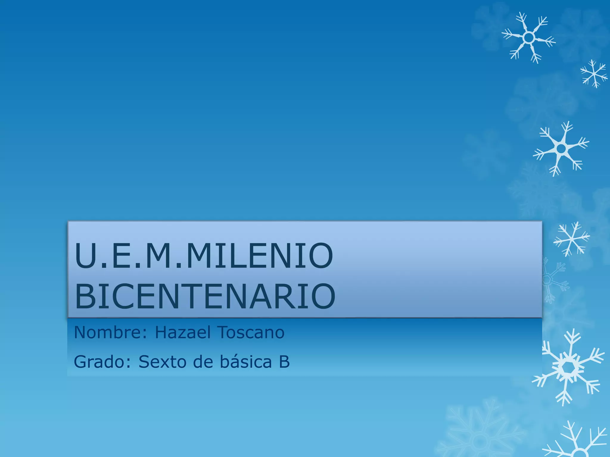 Este documento presenta información sobre un estudiante. Contiene el nombre del estudiante, Hazael Toscano, y su grado actual, el sexto de básica B, en la escuela U.E.M. Milenio.
