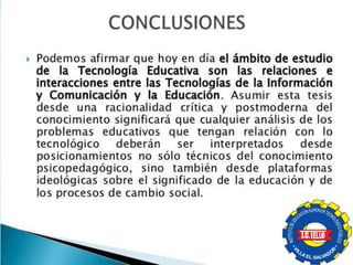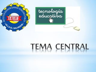 Este documento presenta una introducción a la tecnología educativa y de comunicación (TEC). Define la TEC como el conjunto de tecnologías que permiten adquirir, producir, almacenar, procesar, comunicar, registrar e presentar información. Explica la diferencia entre TEC y TIC, señalando que TEC se refiere originalmente al uso de medios de comunicación para fines educativos, mientras que TIC se refiere al enfoque sistemático de la enseñanza considerando recursos técnicos, humanos e interacciones
