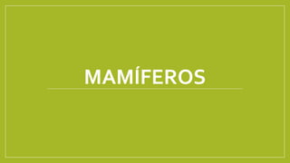 Los mamíferos se caracterizan por tener pelo, ser vivíparos y amamantar a sus crías con leche producida por glándulas mamarias. Presentan diversos aparatos como el respiratorio con pulmones, el digestivo con dientes para masticar, y el óseo con huesos incluyendo el cráneo. También tienen sistema nervioso desarrollado y sistema reproductor sexual con hembras que gestan internamente a sus crías. Existen varias clasificaciones de mamíferos.