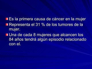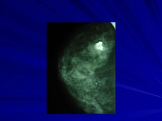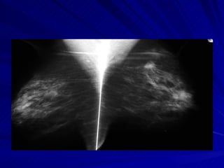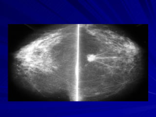 La mamografía es el primer método de diagnóstico para el cáncer de mama, que es la principal causa de cáncer en las mujeres. Se recomienda realizar mamografías anuales a partir de los 40 años de edad para detectar cáncer de mama de manera temprana. El diagnóstico puede incluir mamografía, ecografía, resonancia magnética o biopsia. Las mamografías deben interpretarse cuidadosamente para identificar anormalidades como nódulos, asimetrías, microcalcificaciones u otras señales que puedan ser indic