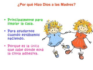 Los niños describen a las madres como personas que limpian la casa, ayudan cuando nacen los bebés y siempre saben dónde está la cinta adhesiva. Dicen que Dios hizo a las madres de tierra, magia, súper poderes y partes grandes. Explican que sus madres se casaron con sus padres porque les gusta la comida del padre o porque no usaron gorra para pensar. Consideran que las madres tienen más responsabilidades que los padres y el verdadero poder en la casa aunque quisieran cambiar algunas cosas como