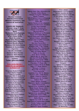 Este documento presenta una revista cristiana interdenominacional llamada "Maná" que ofrece noticias e información sobre iglesias, ministerios y eventos de diferentes denominaciones cristianas evangélicas. Incluye horarios de iglesias, actividades, testimonios, artículos sobre temas espirituales y sociales. También presenta al equipo de trabajo de la revista y agradece la participación de 68 ministerios de Argentina, Chile, Costa Rica, México, Panamá, Puerto Rico, República Dominicana, Uruguay y Estados Unidos.
