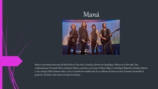 Maná es una banda mexicana de rock latino y pop rock formada en 1987 en Guadalajara, México. La banda está compuesta por Fernando Olvera, Juan Calleros, Alejandro González y Sergio Vallín. Maná ha vendido más de 40 millones de discos en todo el mundo, convirtiéndose en el grupo de rock latino más exitoso. La banda ha ganado numerosos premios como 4 Grammys y 8 Latin Grammys.