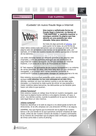 Este documento describe un nuevo tipo de fraude en Internet llamado "tab napping" o pestaña inactiva. Los ciberdelincuentes crean páginas web falsas pero idénticas a las originales y utilizan código JavaScript para redirigir pestañas inactivas en los navegadores a estas páginas clonadas sin que el usuario se dé cuenta. De esta forma pueden robar datos bancarios u otra información confidencial. Se aconseja estar atento a la dirección URL, especialmente si empieza por "HTTPS", para asegurarse de estar en