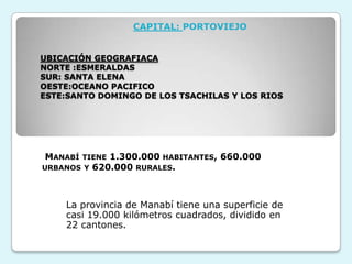 El documento proporciona información sobre los atractivos turísticos de la provincia de Manabí, Ecuador. Manabí tiene una superficie de casi 19.000 km2 y 1.3 millones de habitantes. Ofrece playas como Cojimíes, Pedernales y Crucita para actividades de sol y mar, así como ecoturismo en áreas protegidas como Bahía de Caráquez y el Parque Nacional Machalilla. También cuenta con sitios arqueológicos como Cerros de Hojas y Jaboncillo, museos, gastronomía local y deportes