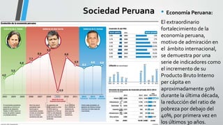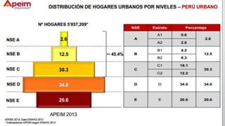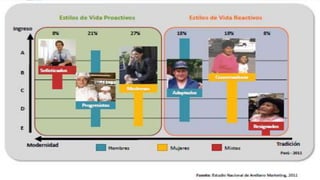 El documento analiza la estructura de la sociedad peruana y su economía, destacando un fortalecimiento significativo en los indicadores económicos y cambios en el nivel socioeconómico de la población. Se identifican diferentes estilos de vida y segmentos demográficos que afectan el comportamiento del consumidor, incluyendo las generaciones desde los Baby Boomers hasta la Generación Z. Además, se enfatiza la oportunidad de negocio en la base de la pirámide, que representa un alto porcentaje de la población y un mercado significativo en América Latina.