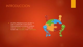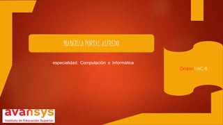 Alfredo Mancilla presenta su visión, misión, valores y fortalezas como estudiante de computación e informática. Su visión es convertirse en un profesional ético que trabaje para satisfacer sus necesidades y las de su familia, adaptándose a la tecnología y fortaleciendo sus conocimientos. Su misión es ser más responsable en sus estudios para lograr sus metas y aprovechar oportunidades. Sus valores incluyen la responsabilidad, el optimismo, la honestidad, la transparencia y la dedicación al trabajo. Sus fortalezas son la perseverancia