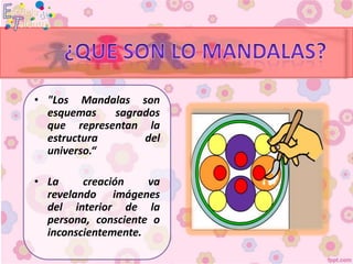 El documento habla sobre los mandalas, que son esquemas sagrados que representan la estructura del universo. Los mandalas tienen una disposición concéntrica y están presentes en todas las culturas desde tiempos antiguos. Representan tanto el macrocosmos del cosmos como el microcosmos de la energía interna de la persona que los crea.