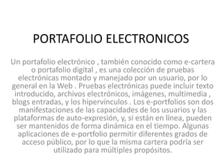 Un portafolio electrónico es una colección de trabajos electrónicos como texto, archivos, imágenes y videos que un usuario monta y gestiona en la web para mostrar sus habilidades. Los portafolios electrónicos permiten a los usuarios expresarse y reflejar su aprendizaje de forma dinámica. Además, ayudan a desarrollar habilidades como el pensamiento crítico, la escritura y la comunicación multimedia.