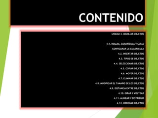 Este documento describe cómo manejar objetos en PowerPoint. Explica cómo insertar, seleccionar, copiar, mover, eliminar y modificar el tamaño de objetos. También cubre cómo alinear y distribuir objetos, girar y voltear objetos, ordenar los objetos y medir la distancia entre ellos.