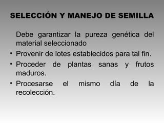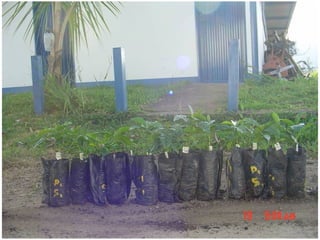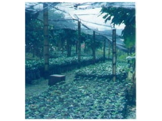 El documento proporciona información sobre el manejo agronómico del café, incluyendo el procesamiento y almacenamiento de semillas, la construcción y desinfección de germinadores, el proceso de germinación, el establecimiento de viveros y plantaciones, y los sistemas de cultivo a plena exposición solar y bajo sombrío.