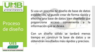 El documento describe los pasos a seguir en el proceso de diseño de una base de datos, incluyendo determinar el propósito, las entidades, atributos, relaciones y perfeccionar el diseño. Explica el modelo entidad-relación y cómo se utiliza para modelar los datos mediante diagramas de entidades y relaciones.