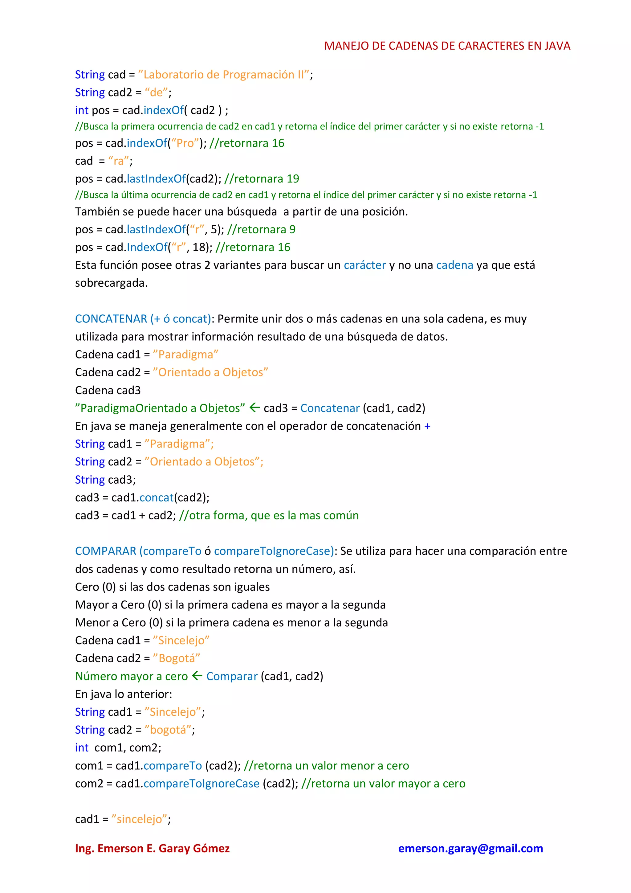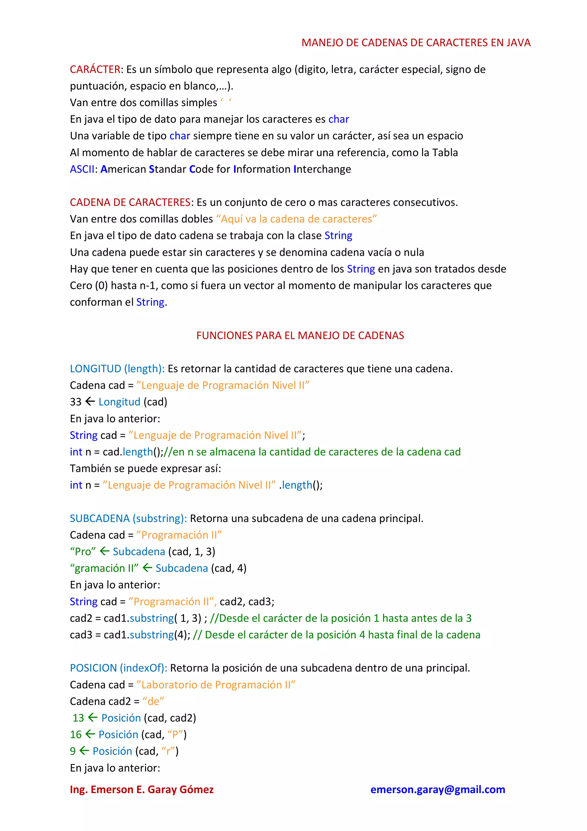 Este documento describe las funciones básicas para el manejo de cadenas de caracteres en Java. Explica que una cadena es un conjunto de caracteres y que en Java se trabaja con la clase String. Detalla funciones como length() para obtener la longitud, substring() para obtener subcadenas, indexOf() para buscar posiciones, concat() para unir cadenas, y compareTo() para comparar cadenas. También cubre convertir entre cadenas y números, y cambiar entre mayúsculas y minúsculas.