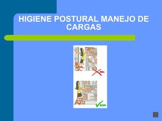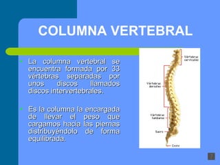 La columna vertebral está formada por 33 vértebras separadas por discos intervertebrales y es responsable de distribuir el peso del cuerpo de forma equilibrada entre las piernas. Existen varios factores de riesgo para la salud osteomuscular como el sobrepeso, malos hábitos posturales, trabajo repetitivo y levantamiento inadecuado de cargas. Para prevenir lesiones, es importante evaluar las tareas, levantar cargas con las piernas flexionadas, mantener la espalda recta y evitar torsión del tronco.