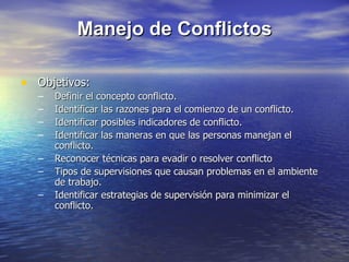 El documento habla sobre el manejo de conflictos y estrategias para minimizarlos. Define qué es un conflicto y sus causas comunes. Explica que aunque el conflicto es inevitable, puede ser constructivo si se resuelve de manera adecuada mediante una buena comunicación y el uso de técnicas como escucharse mutuamente, establecer metas claras y tomar acciones para solucionar problemas.