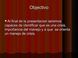 El documento trata sobre el manejo de crisis. Explica que el manejo de crisis es el manejo estratégico de la información y comunicaciones ante situaciones que puedan amenazar la reputación de una institución. Una crisis es cualquier evento que amenaza la imagen y reputación de una institución. El manejo de crisis se orienta a la planeación, control y manejo de situaciones excepcionales que representan riesgos. Se recomienda formar un equipo de manejo de crisis con grupos administrativo, de apoyo táctico, de operaciones y especialistas. El document