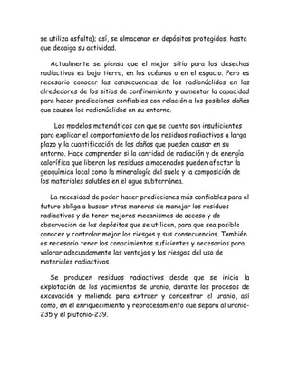 Los residuos radiactivos provienen de plantas nucleares y yacimientos de uranio y incluyen líquidos, gases y sólidos. Los líquidos y gases de baja a mediana radiactividad se filtran y almacenan temporalmente, mientras que los sólidos de alta radiactividad como las varillas de combustible gastado requieren aislamiento por miles de años. La eliminación permanente de los desechos de alta actividad ha resultado problemática y se siguen buscando métodos seguros a largo plazo como enterrarlos profundamente en depó