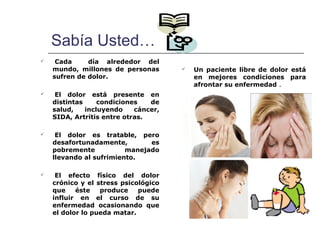 Este documento resume la definición, tipos, evaluación y manejo del dolor en pacientes ambulatorios. Explica que el dolor puede ser nociceptivo, neuropático o psicógeno, y puede ser leve, moderado o severo. Describe las escalas para evaluar el dolor y la escalera analgésica de la OMS para el tratamiento del dolor. Finalmente, resume las características y mecanismos de acción de los opioides y AINES en el manejo del dolor.