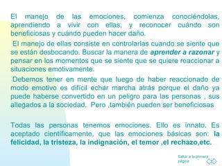 El documento trata sobre el manejo de las emociones. Explica que es importante conocer las propias emociones, aprender a vivir con ellas y reconocer cuándo son beneficiosas o dañinas. También habla sobre la importancia de controlar las emociones cuando se sienten desbordadas y aprender a razonar en lugar de reaccionar emocionalmente. Además, menciona algunas técnicas concretas para manejar emociones como la ansiedad y la ira, como respirar profundamente y relajación muscular.