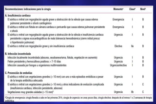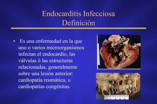 Este documento proporciona información sobre el manejo de la endocarditis infecciosa, incluidas definiciones, clasificaciones, manifestaciones clínicas, estudios de laboratorio, criterios de diagnóstico, tratamiento antibiótico y quirúrgico, y complicaciones. La endocarditis infecciosa es una infección de las válvulas cardíacas o estructuras relacionadas, generalmente sobre una lesión previa. El documento describe los patrones microbiológicos comunes, los regímenes de tratamiento recomendados y los
