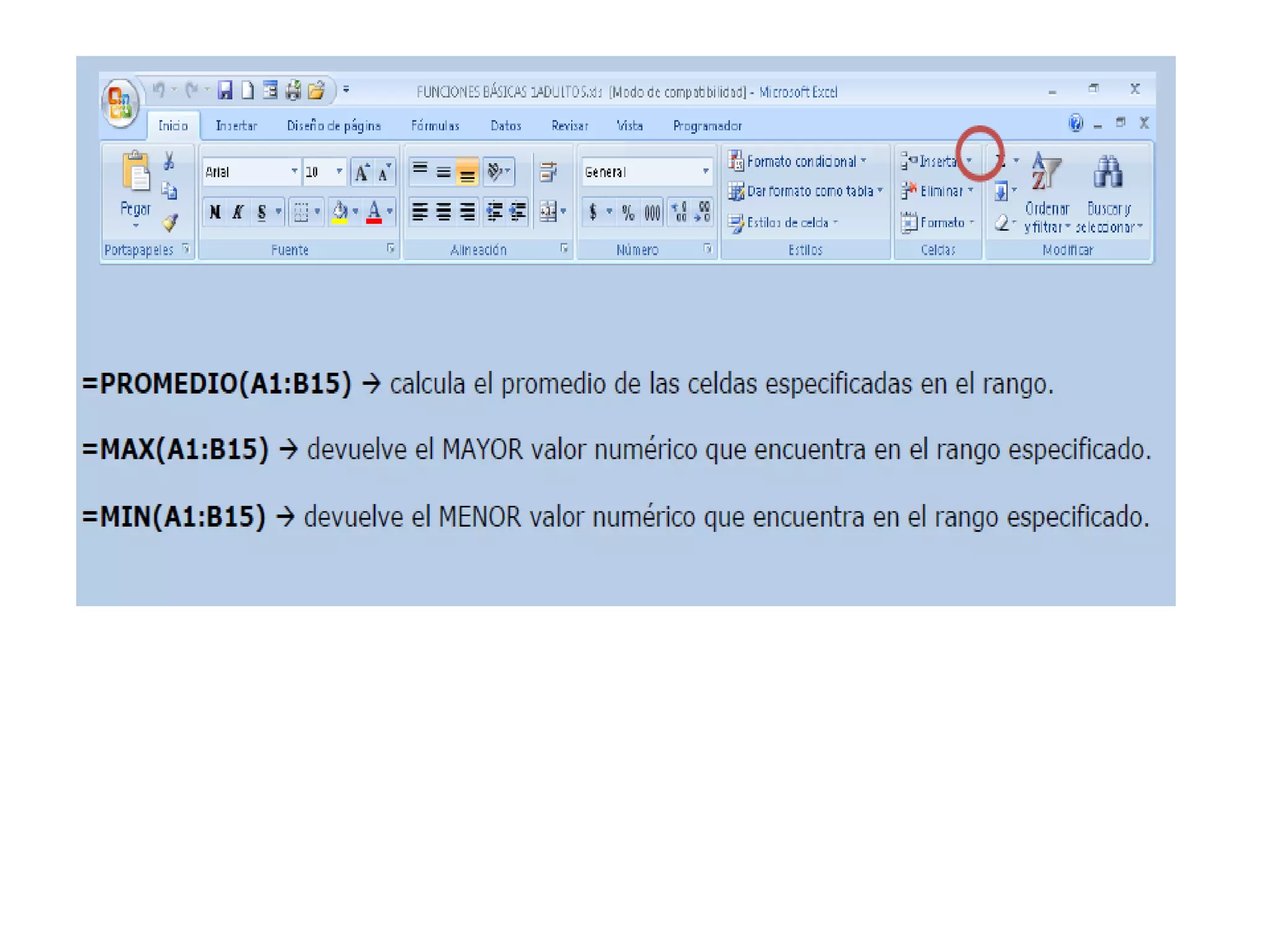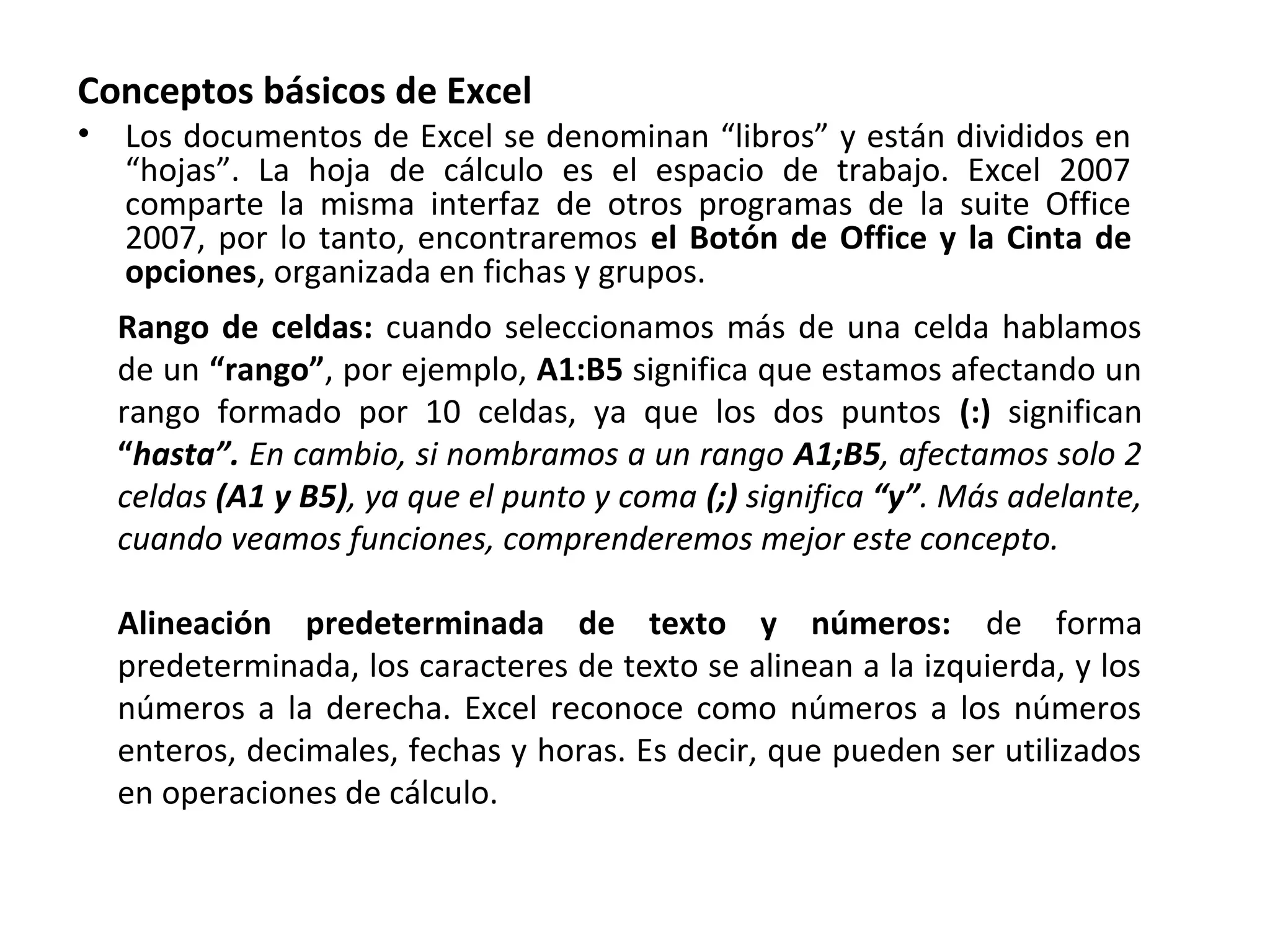 Este documento proporciona una introducción a los conceptos básicos de Excel 2007, incluyendo hojas de cálculo, celdas, rangos de celdas, formatos de texto y números, y operaciones de cálculo. También explica cómo aplicar formatos condicionales y usar funciones para simplificar cálculos.