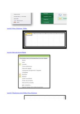 Este documento contiene 37 lecciones sobre el uso de Excel. Introduce Excel como un programa de hoja de cálculo que permite realizar cálculos, usar formatos de texto y colores, e insertar gráficos y funciones. Las lecciones cubren temas como abrir y guardar archivos, trabajar con filas, columnas y celdas, aplicar formatos, realizar operaciones matemáticas, copiar y pegar datos, e insertar gráficos y diagramas. El objetivo es enseñar las funciones básicas de Excel para ayudar a crear