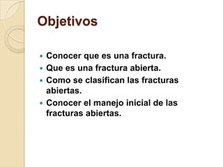 Este documento presenta información sobre el manejo inicial de las fracturas abiertas. Explica que una fractura abierta es aquella en la que los tejidos óseos están expuestos al exterior, y clasifica las fracturas abiertas según su gravedad y ubicación. Describe las medidas de manejo extra e intrahospitalario, incluyendo cubrir la herida, controlar hemorragias, inmovilizar la fractura, administrar antibióticos y realizar lavado quirúrgico para prevenir infecciones. El objetivo del manejo inicial es evitar infecciones,