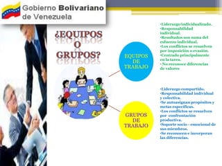 Este documento describe las diferencias entre grupos y equipos. Los grupos se centran principalmente en las tareas y los resultados individuales, mientras que los equipos comparten responsabilidades y propósitos. También discute cómo manejar efectivamente los grupos a través de la escucha activa, resolución de conflictos y toma de decisiones colaborativa. El trabajo en equipo puede mejorar los resultados individuales y organizacionales al fomentar una mayor identificación, autonomía y logros compartidos.