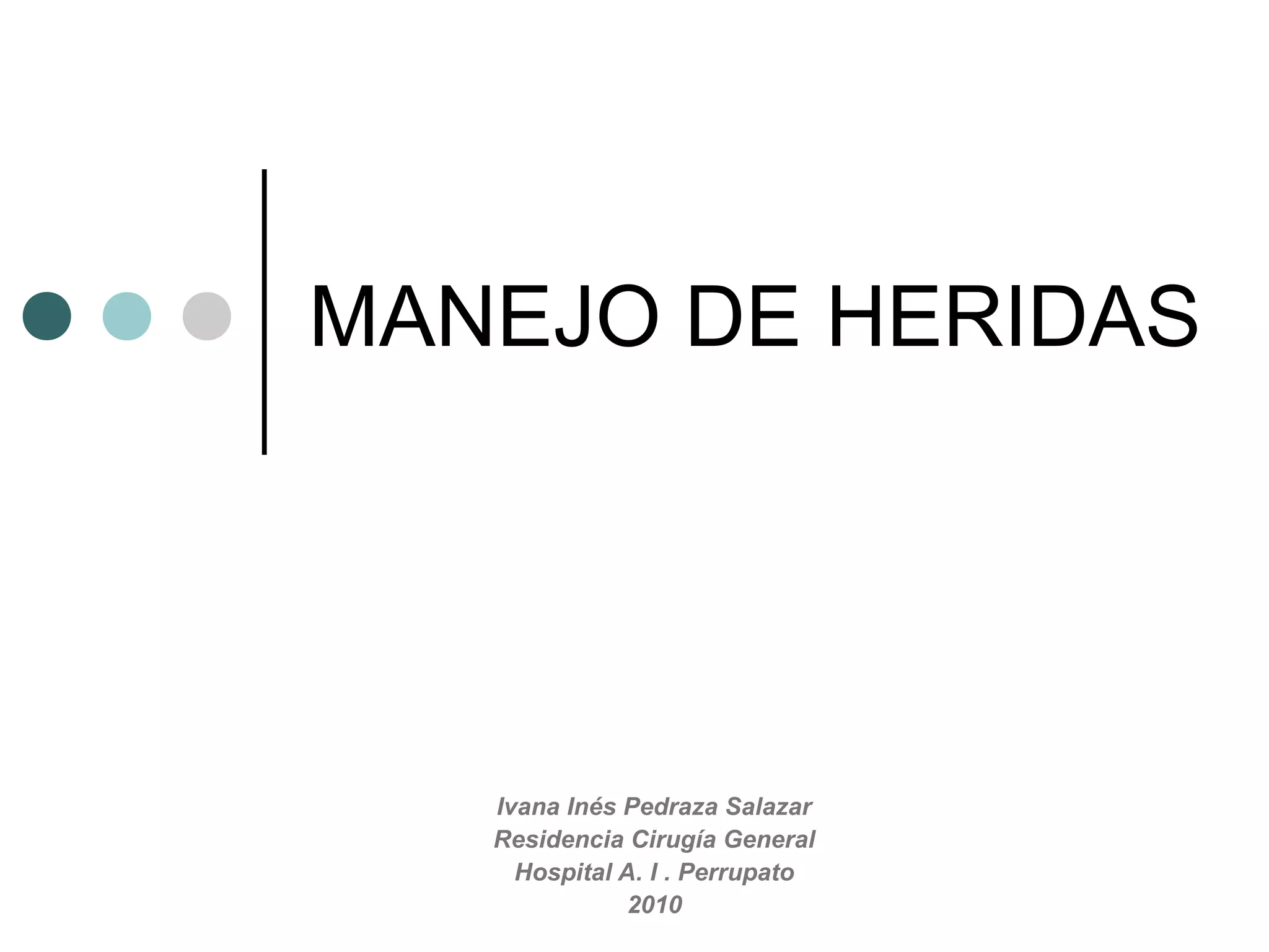 El documento trata sobre el manejo de heridas. Explica los objetivos del cierre de heridas como la hemostasia, anestesia, lavado, exploración y extirpación de tejido dañado. También cubre temas como la evaluación del paciente, la herida y factores que complican la cicatrización, así como técnicas de limpieza, sutura, apósitos y el seguimiento posterior del paciente.