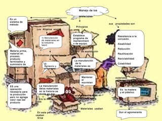 El documento describe el manejo de materiales como un sistema para mover materia prima, material en proceso, productos terminados y suministros a través de la producción. El manejo de materiales es necesario para la producción pero no agrega valor real al producto. Se divide en las operaciones de manutención de materiales en industrias fabriles, de transporte y comercio. La evolución del manejo de materiales se divide en una etapa de manipulación manual antes de 1900 y una etapa de manutención mecanizada a partir de 1901 usando equipos.