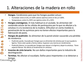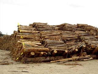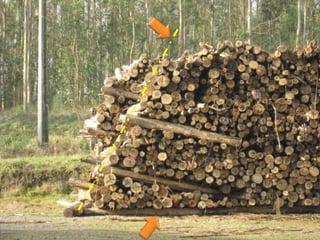 Este documento proporciona recomendaciones para el manejo de rollos de madera en parques para industrias de desintegración. Recomienda procesar la madera lo antes posible, especialmente si está dañada, y rotarla continuamente para mantener la calidad. También recomienda apilar la madera de manera que facilite la circulación del aire para prevenir el desarrollo de hongos e insectos, y almacenar registros detallados de cada pila.