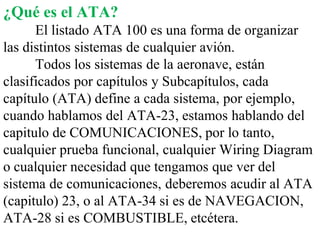 El documento explica los conceptos fundamentales relacionados con el mantenimiento de aeronaves, incluyendo el sistema ATA para organizar los sistemas de la aeronave, las modificaciones posteriores a la fabricación conocidas como SB, y los manuales clave como el AMM que contiene información para tareas de mantenimiento.