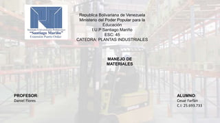 Este documento presenta información sobre el manejo de materiales. Explica que el manejo de materiales se refiere al movimiento de todo tipo de materiales y que existen numerosas formas de hacerlo clasificadas por el tipo de equipamiento usado. Luego describe varios principios del manejo de materiales, diferentes tipos de equipos como grúas y transportadores, y características de palets y diseños de almacenes. El documento proporciona detalles técnicos sobre conceptos clave relacionados con el manejo eficiente de materiales en entornos industriales