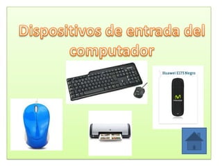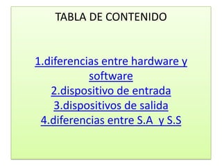 Este documento habla sobre los componentes básicos de hardware y software de una computadora. Explica que el hardware son las partes físicas como el monitor, teclado, ratón, mientras que el software son las instrucciones que hacen funcionar la computadora. También describe diferentes dispositivos de entrada como el ratón, teclado y de salida como el monitor, impresora y proyector.